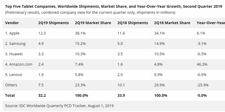 Menurut laporan IDC, secara keseluruhan ada sekitar 32,2 juta tablet yang dikapalkan ke pasar global pada Q2 2019. Dari jumlah ini, sebanyak 12,3 juta merupakan produk iPad.