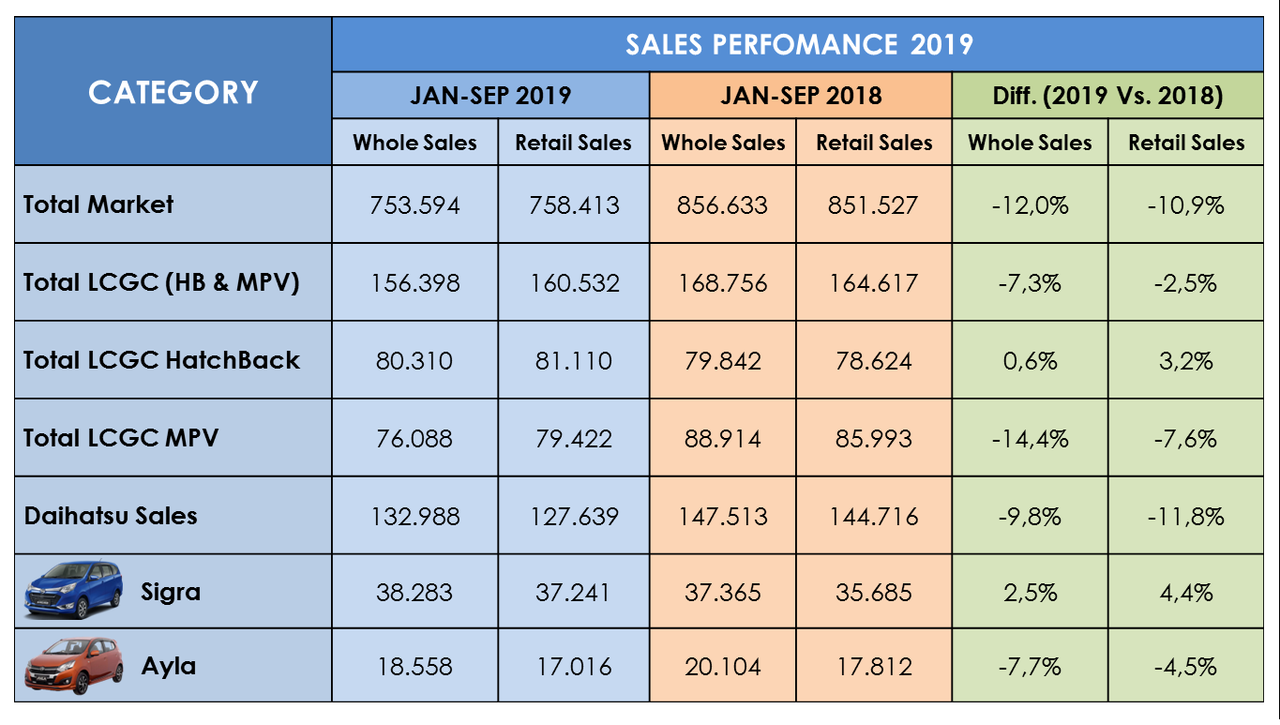 Pada segmen LCGC hingga kuartal ketiga 2019, mencapai 160.532 unit, atau menurun 2,5 persen dibandingkan tahun lalu. Namun, kontribusi di segmen LCGC meningkat dari 19,3 persen pada tahun 2018, menjadi 21,2 persen pada 2019.